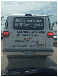 I was also good at making others look bad to make me look better. I could easily admonish them for all their faults and failures without skipping a beat. I could even quote Scripture verses to shore up my convictions. “Oh yeah, you think you’re a shoo-in for heaven? Well, I’ve got news for you – you’re screwed. Matthew says so, ‘For the gate is narrow, and the way is hard that leads to life, and those who find it are few – very few – almost no one!’” (Matt. 7:13–14). I hate to tell you (NOT!), but this is not your lucky day, and tomorrow ain’t lookin’ too good either if you don’t change your ways! Don’t say I didn’t warn you. You’re welcome!
